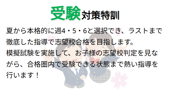 上位進学高校受験を目指し地元中学校の進路内容にあわせ、内申書対策に対応した地域密着型指導。